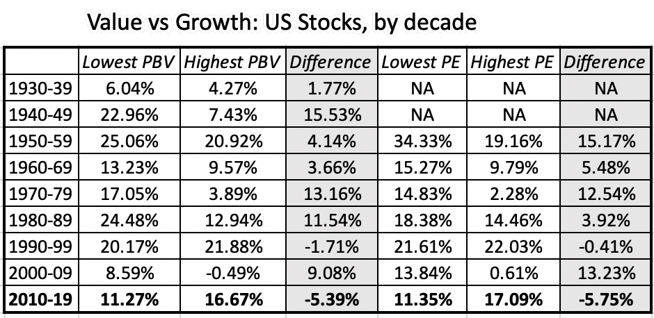 要了解这一时期(2010-2019年)的异常值有多大,请看一下按十年为时间间隔划分的低PBV和高PBV股票的回报率:
