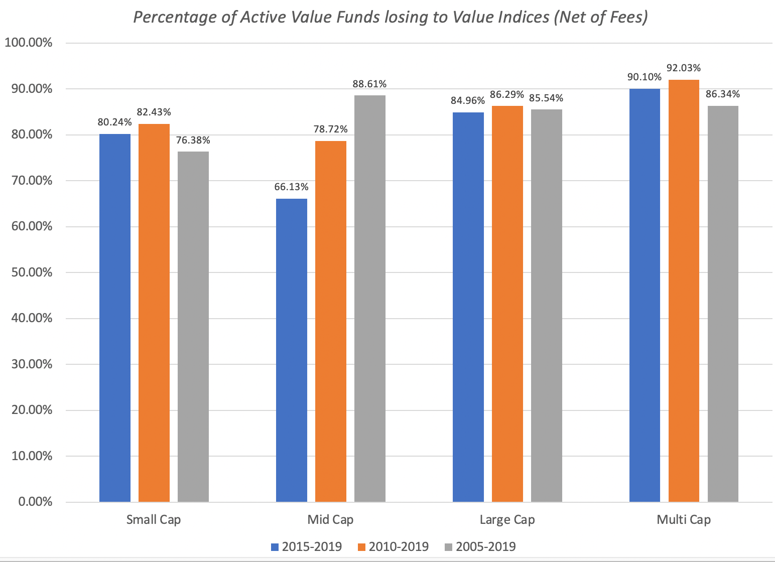 下面列出了2005-2019年针对所有不同市值类别(大、中、小)的价值投资者的SPIVA衡量指标(蓝色为2015-2019,橙色为2010-2019,灰色为2005-2019):