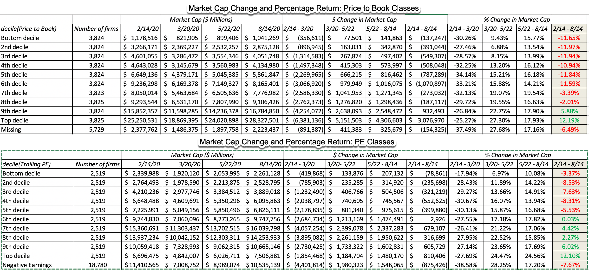 虽然这一逻辑可能很吸引人,但结果并非如此。正如下表所示,我查看了2020年2月14日(危机开始时)根据PE和PBV分类的股票,并考察了之后六个月内总市值的变化: