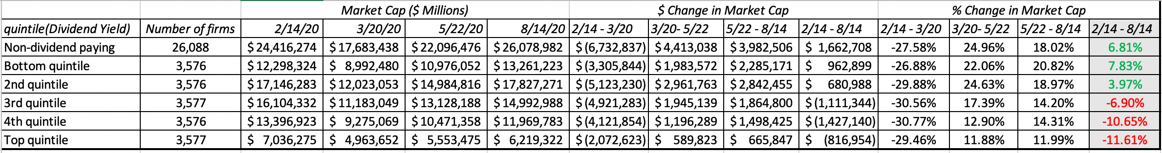 根据股息率对公司进行细分,并观察市值变化,得出以下结果: