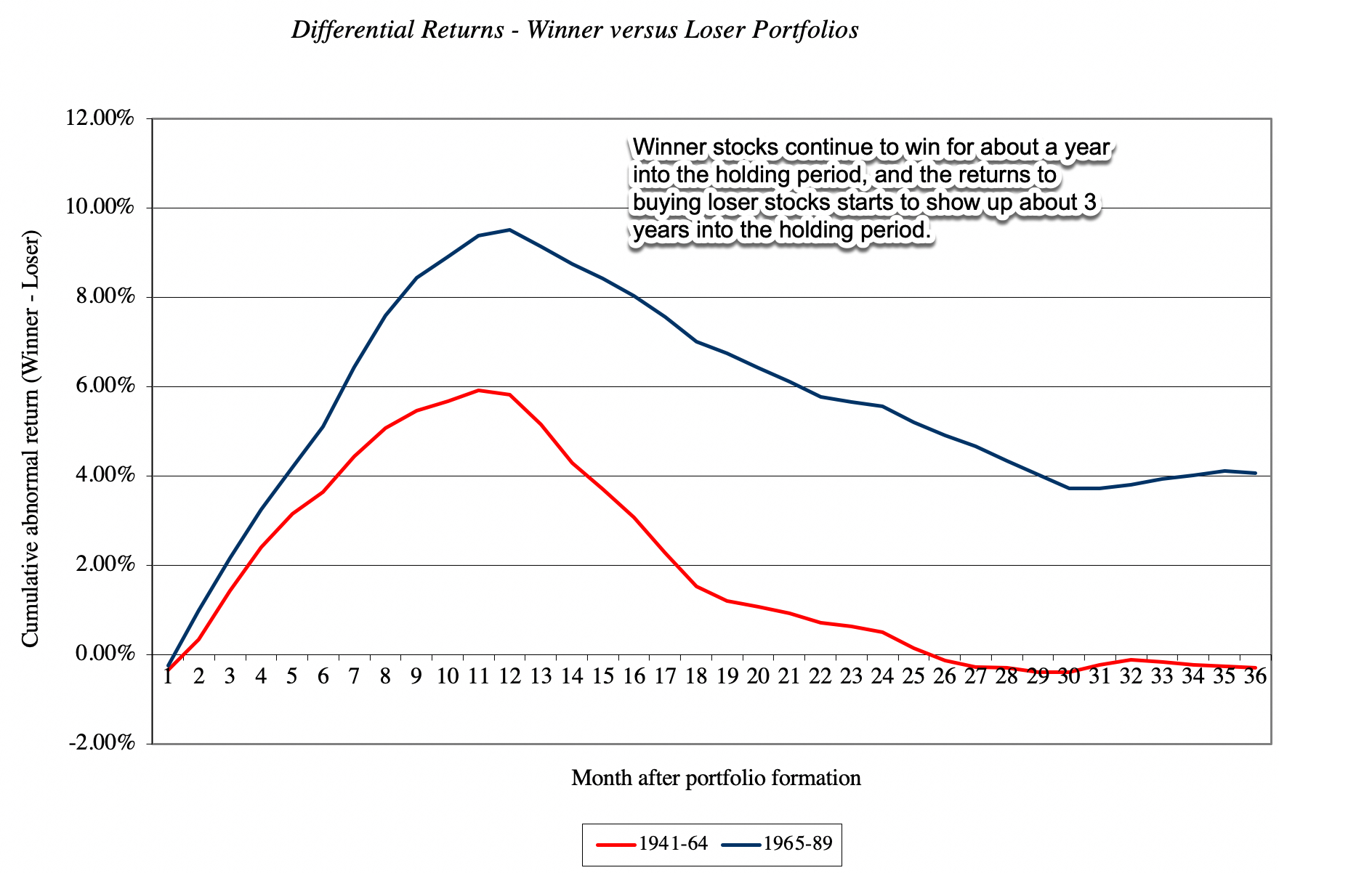 请注意,在所考察的两个时间段内,投资组合创建后的前12个月,赢家股票继续赢,尽管这些超额收益在此后的几个月逐渐消失。
