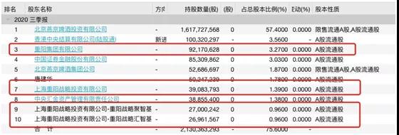据2020年第三季度财报显示,重阳集团有限公司为第三大股东,持股9217万股,占总股本比例3.27%,另外上海重阳战略投资有限公司、重演战略聚智基金、重阳战略汇智基金均为前十大股东,持股比例分别为1.39%、0.96%、0.96%。