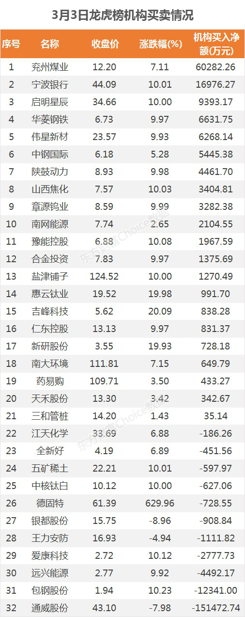 摘要【龙虎榜:7.4亿资金抢筹兖州煤业 机构净买这21股】3月3日,指数全天单边上行,截至收盘,沪指涨1.95%,报收3576点;深成指涨1.23%,报收14932点;创业板指涨1.04%,报收2997点。盘面上,题材全线收红,钛白粉、农机、钢铁等板块涨幅居前。