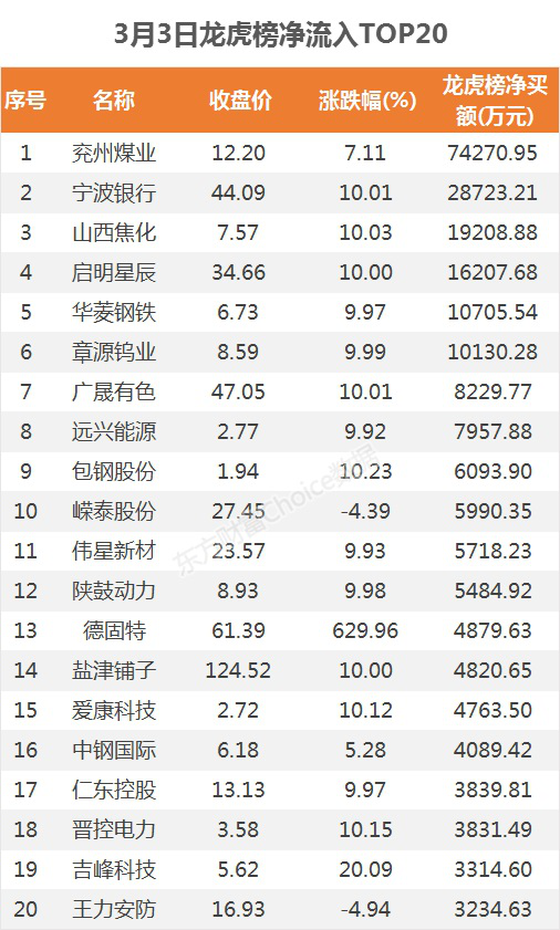 龙虎榜净流入TOP203月3日,上榜龙虎榜个股中,资金净流入最多的是兖州煤业,为7.4亿元。数据显示,该股日内大涨7.11%,全天换手率4.07%。具体看,沪股通净买入2.3亿元。