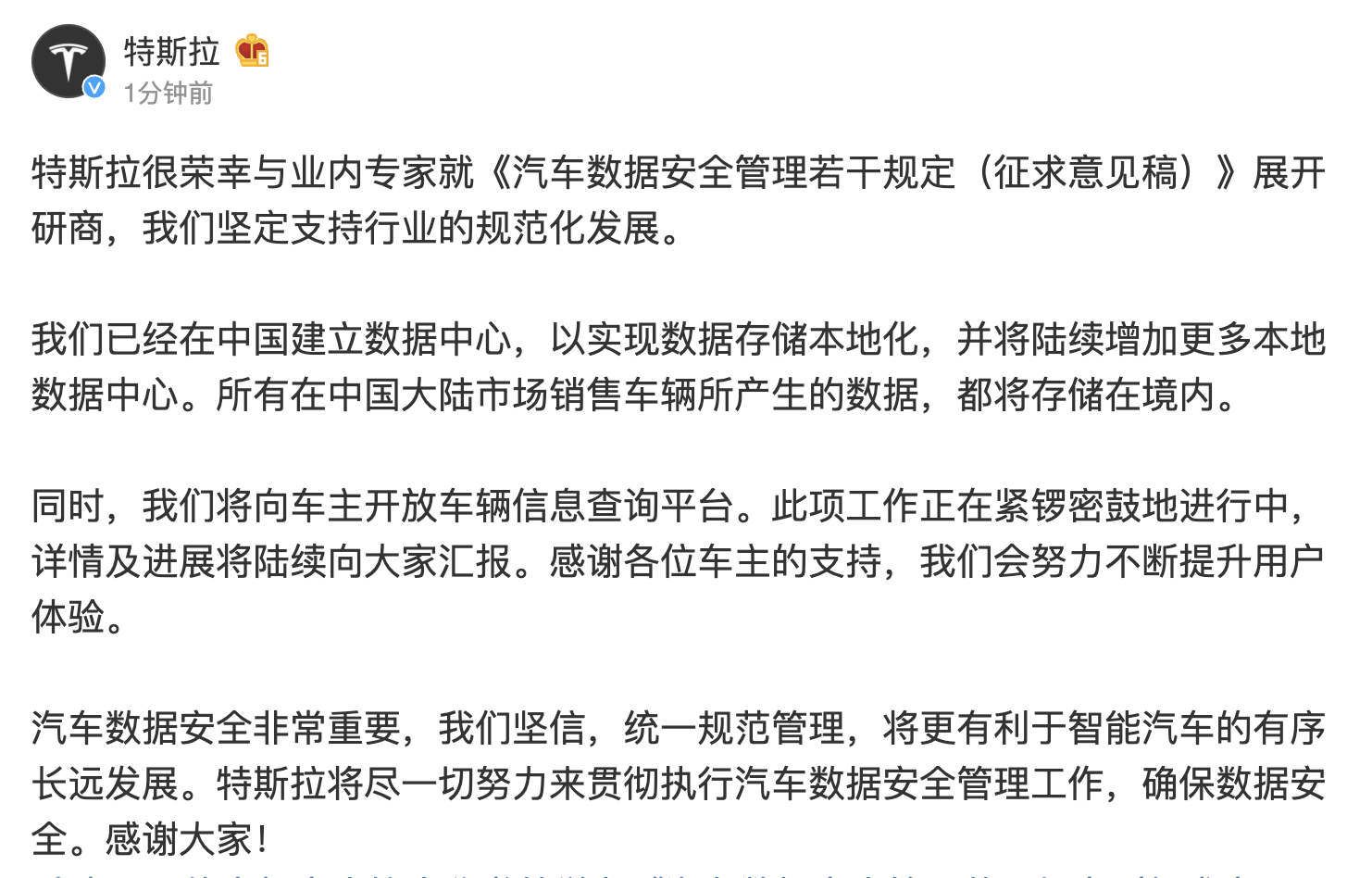 特斯拉官方微博发文称,特斯拉已经在中国建立数据中心,以实现数据存储本地化,并将陆续增加更多本地数据中心。所有在中国大陆市场销售车辆所产生的数据,都将存储在境内。同时,特斯拉将向车主开放车辆信息查询平台。此项工作正在紧锣密鼓地进行中,详情及进展将陆续向大家汇报。