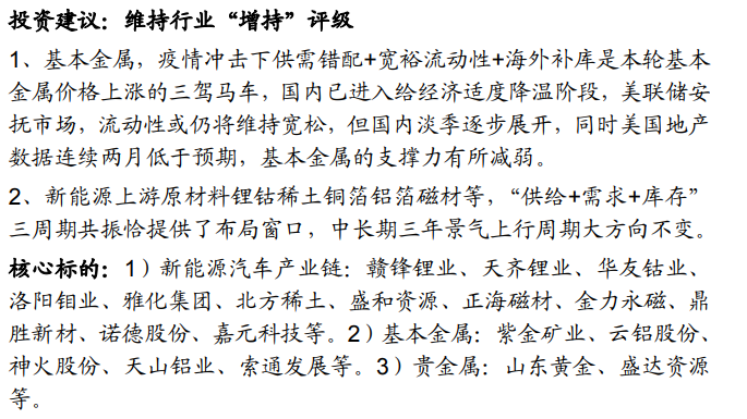 浙商证券提到,随着下游新能源汽车的持续高景气以及冶炼产能和资源的不匹配,将继续拉动锂精矿和锂盐价格上涨,锂资源自给率高和锂盐市占率高的企业将是未来投资的重点;工业金属方面,在美联储转鹰之前的时间窗口,铜、铝等工业金属相关标的仍有新一轮上涨行情,其中铝的供给限制更明确,更看好铝相关标的。