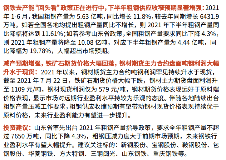 光大证券提到,钢铁去产能“回头看”政策正在进行中,下半年粗钢供应收窄预期显着增强:2021年1-6月,我国粗钢产量为5.63亿吨,同比增长11.8%,较去年同期增长6431.9万吨。如若全国各地均提出粗钢产量同比不增长,则2021年下半年粗钢产量同比降幅将达到11.61%;如若参考山东省政策,全国粗钢产量要求同比下降4.3%,则2021年粗钢产量将降至10.08亿吨,对应下半年粗钢产量为4.44亿吨,同比降幅为19.78%,大幅超出市场预期。