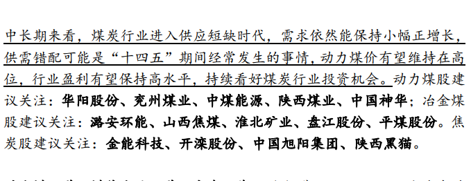 信达证券提到,当前正处在煤炭经济新一轮周期上行的早中期,基本面、政策面、公司面共振,现阶段配置煤炭板块正当时。考虑煤企建矿意愿和能力下降以及3 年以上的建矿周期,煤炭供给在“十四五”期间或难响应需求增长,煤价有望维持高景气度,在龙头煤炭企业普遍降本增效及内生外延成长下,盈利有望趋势抬升。此外龙头煤企现金盈利能力强劲,同时资本开支收窄,富余现金流更大概率回报股东,改善投资者收益水平。当前煤炭板块估值尚未充分体现行业景气程度及持续性,存在较大修复空间。综合来看,我们全面看多煤炭板块,继续推荐关注煤炭的历史性配置机遇。