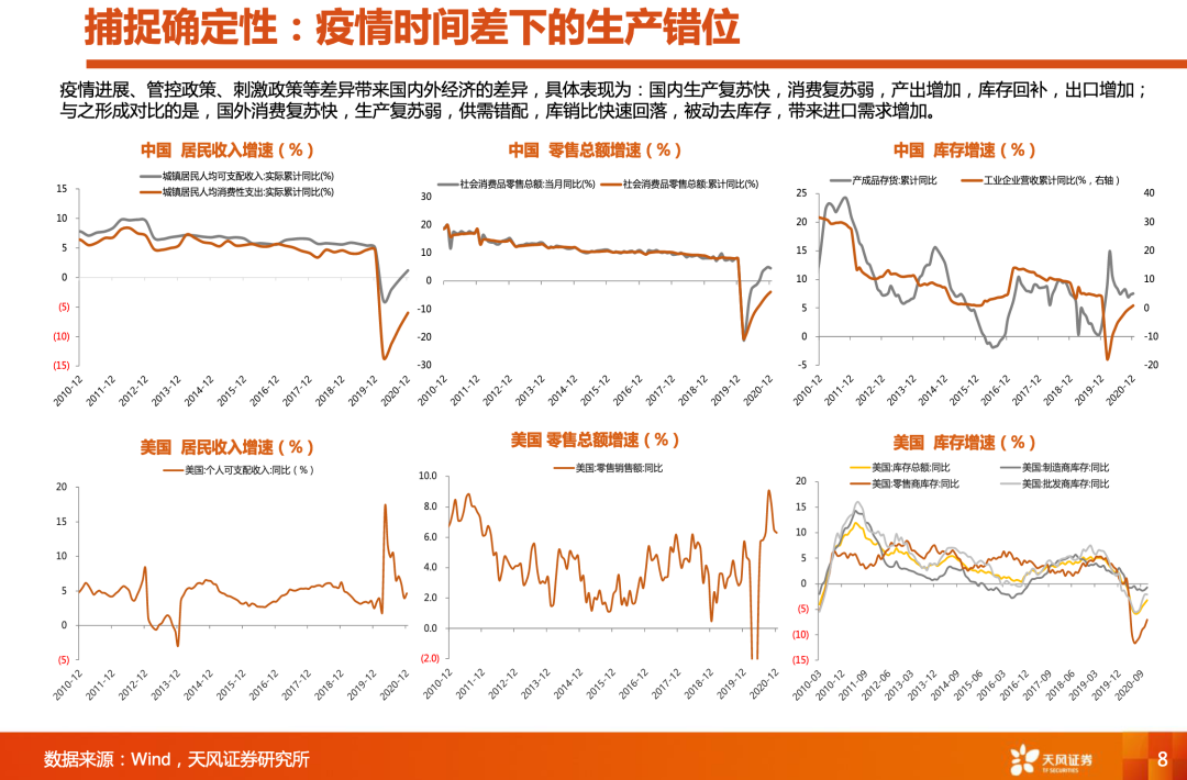 再回到当前,我们看现在最具确定性的是什么。PPT中这六张图是我们对中美居民收入、消费和生产端的比较,这里可以很明显看到疫情带来的一个时间差。由于疫情进展、管控政策、刺激政策等差异带来国内外经济的差异,国内生产复苏快,消费复苏弱,产出增加,库存回补,出口增加;而美国消费复苏快,生产复苏弱,供需错配,库销比快速回落,被动去库存,带来进口需求增加。所以去年下半年出口端首先受益的是成品,比如家电。但是往前,随着疫情的不确定性逐步消除,海外也势必加快恢复生产,海外的制造商开始补库,对应到我们的出口端,受益的品类大概率也会向中游设备和上中游的一些原材料零部件。