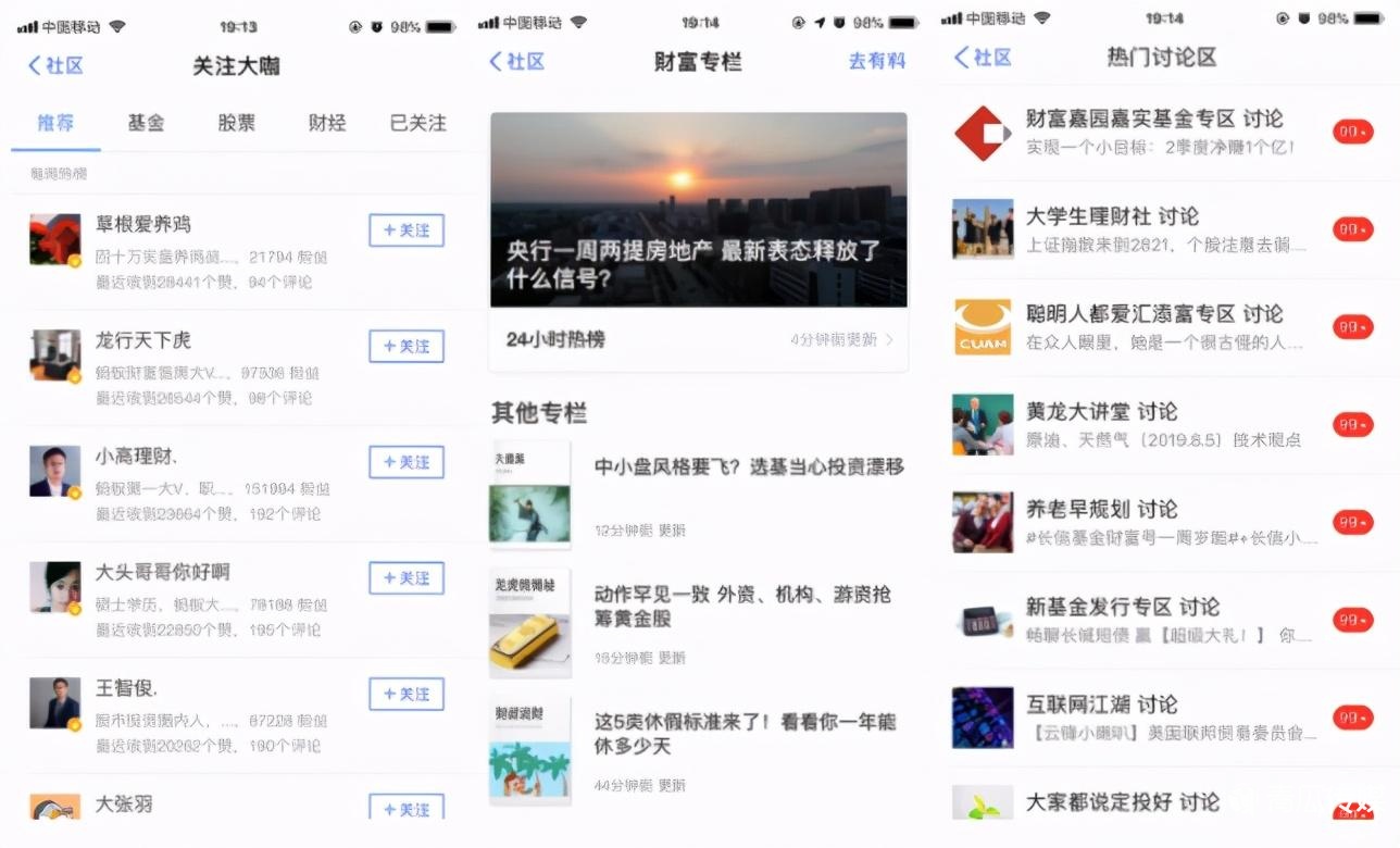 蚂蚁财富的社区由热门讨论区、关注大咖、财富专栏三部分组成。