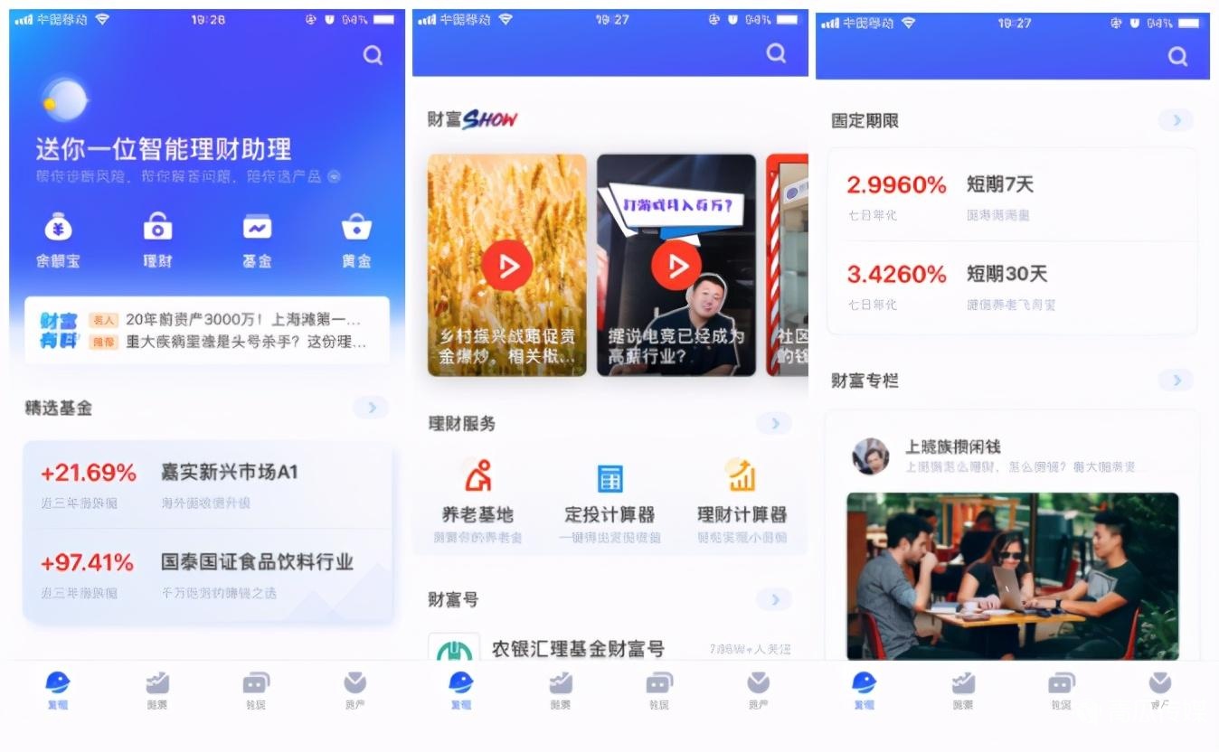 而在其「发现页」,我们会发现其实除了承载了产品核心功能,还有养老、定投计算器、财富号、财富专栏还有财富SHOW 等栏目。