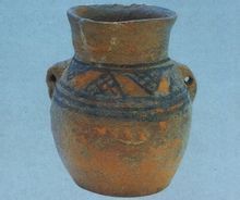 大汶口文化的制陶技术较前已有很大提高。陶质有红陶、灰陶、黑陶和白陶四类。陶器装饰以镂刻和编织纹最具特色。常见的纹饰则有锥刺纹、附加堆纹、弦纹、划纹和篮纹。彩陶不多。彩陶上以黑彩和红彩绘平行线纹、弦纹、叶纹、花瓣纹、八角星纹等几何图案。陶器盛行三足器和圈足器。器形有罐形鼎、钵形鼎、壶形鼎、背壶、长颈壶、深腹罐、高柄豆等。高柄杯和白陶器是大汶口文化中最具特征的陶器。在早、中、晚3期中,陶器的陶色、纹饰、器形都略有变化。陶色早期以红陶为主,兼有一些灰陶与黑灰陶。中期红陶减少,灰陶增多,兼有一些黑陶和白陶。晚期黑陶大为增多,并有少量红陶、灰陶和白陶。陶器的制法,早期以手制为主,到了晚期轮制逐渐增多。陶器纹饰,早期有锥刺纹、划纹和少量彩陶。彩陶上多为黑彩线条纹和叶脉纹。主要器形有釜形鼎、钵形鼎、小口带柄壶形鼎、敛口平底钵,也有在上腹部饰彩的陶钵、高柄豆、高柄觚、双耳壶等。中期又出现了附加堆纹、篮纹、压印纹和镂刻 大汶口遗址墓葬遗址
