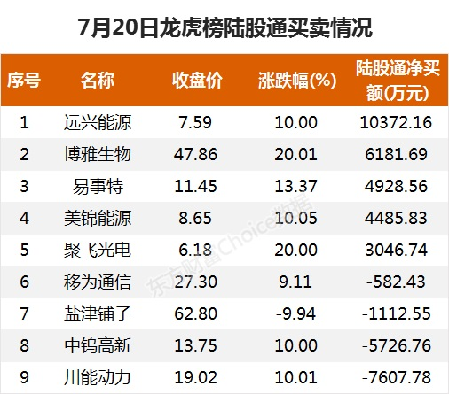 陆股通参与龙虎榜中个股共涉及9股,其中5股被陆股通净买入,远兴能源被买入最多,为1.04亿元。另外4股被陆股通净卖出,川能动力被卖出最多,为7607.78万元。