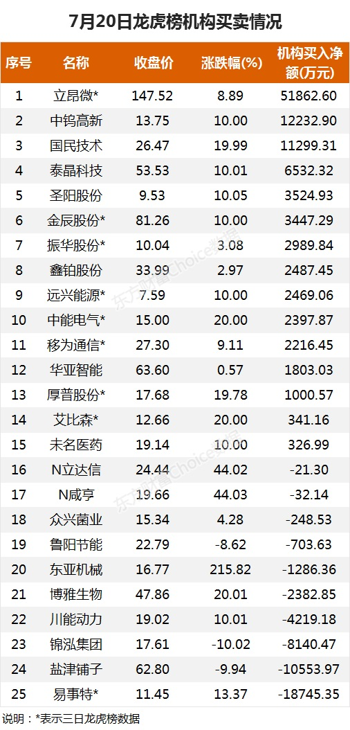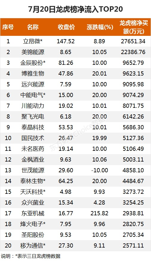 7月20日,上榜龙虎榜个股中,资金净流入最多的是立昂微,三日净买入2.8亿元。数据显示,该股日内大涨8.89%,三日累计涨幅20.99%。