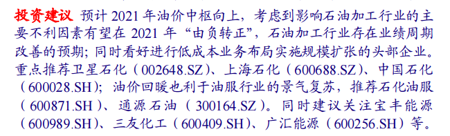 中国银河证券提到,预计2021年油价中枢向上,考虑到影响石油加工行业的主要不利因素有望在2021年“由负转正”,石油加工行业存在业绩周期改善的预期;同时看好进行低成本业务布局实施规模扩张的头部企业。