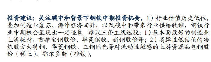 中信证券表示,需求端在整体宏观经济复苏的驱动下,制造业海内外共振上行主线明晰,同时建筑材需求的韧性也值得期待。供应端碳达峰大背景约束有望带来行业供应超预期收缩,我们判断钢铁行业将出现明显供需缺口,随之而来的行业利润中枢有望显著提升。当前时点我们认为处于低利润、低估值状态的钢铁行业已具备很高的投资性价比,持续重点推荐宝钢股份、南钢股份、马钢股份、三钢闽光,建议关注华菱钢铁。