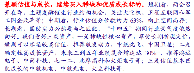 中国银河证券进一步指出,兼顾估值与成长,继续买入稀缺和优质成长标的。短期看,两会召开在即,主题发酵催生行业结构机会,关注大飞机、卫星互联网和军工国企改革等;中期看,行业估值分位数约为63%,向上空间尚存;长期看,国防实力必然要与之匹配,“十四五”期间行业景气度依然向好。我们看好三类资产,一是稀缺性核心资产,享受长期折现定价,短期可以容忍较高估值;二是确定性高成长资产,未来三到五年业绩复合增速达30%+;三是估值基本匹配成长的标的。