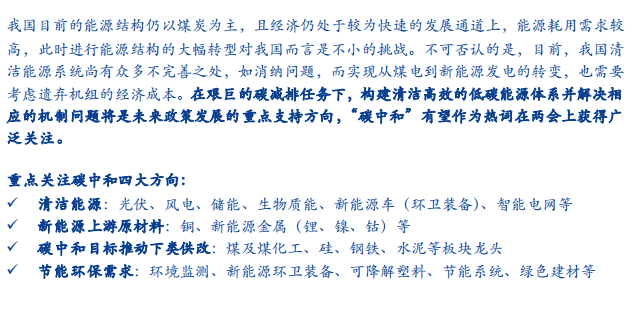 碳中和目标利好四大主线:清洁能源:光伏、风电、储能、生物质能、新能源车、智能电网等;新能源上游原材料:铜、新能源金属(锂、镍、钴)等;碳中和目标推动下类供改:煤及煤化工、硅、钢铁、水泥等板块龙头;节能环保需求:环境监测、新能源环卫装备、可降解塑料、节能系统、绿色建材等。