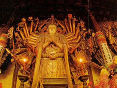 殿内正面是一尊8.3米高的千手千眼观音菩萨立像,造型奇特,比例匀称,金箔覆身,金光熠熠。千手千眼观音菩萨实际上左右只有20手臂,每个手中心各有一眼,40只手、40只眼分别乘以佛家的"二十五有",就构成了千手千眼。按照佛经的解释,千手千眼是观音的"六种变相"之一,象征能洞察人间一切祸福。额头上的那只眼睛,象征她已修行到了"三摩"境界,所持的轮、螺、伞、幢、花、瓶、鱼、结等8种法器,象征着吉祥如意;手握的刀、枪、剑、戟,据说是用来降魔伏妖的;那头边两手上高托的日用,象征主宰宇宙的无量佛法;那胸前四手中高举的哈达,象征着她对祖师虔诚的敬仰……她大而不悍,身姿秀丽,具有温文的女性风度。飘动的衣带、流畅的线条,感情丰富的面庞,处处表现出一种端庄、持重的内涵美。这座佛像不仅是珍贵的宗教艺术品,而且也是我国古代雕塑艺术的杰作。