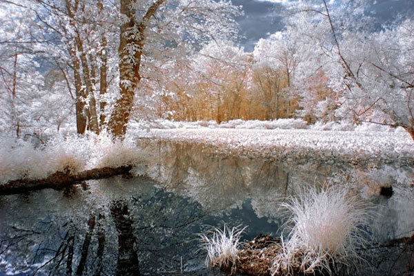 据测试,在自然光辐射中红外线可达40%以上,在黑白摄影中可以通过使用特殊的滤镜从红~深红~暗红来阻挡可见光通过,从而使红外线影像在胶片上感光。如"雷登87C"滤镜几乎可以阻挡全部可见光,以产生较纯的红外摄影效果,这种滤镜肉眼看去几乎不透明,具体操作时应先调好焦后再加滤镜,另外需要试拍以取得正常的曝光量。一般情况下进行红外线摄影可选用"雷登25"红镜,也可产生较比明显的红外效果。那么进行红外线摄影的理由何在呢?分析一下人眼看到最亮的物体,如蓝色的水面和天空,它们并不能反射更多的红外光,这样虽然在普通黑白胶片的成像很正常,在红外线胶片就呈现出较黑的颜色。而树木和草地因叶绿素可以大量反射红外线而发白,以此来达到超乎现实的意境。红外线不仅为摄影提供了特殊的创作手法,同时由于它的透射率高,遇到雾天及烟尘远景也可以拍清楚,在科研中常用于勘探和军事侦察。利用红外线具有穿透图画表层深入颜料内部的特性,它还可以为大师们的名画判断真伪。
