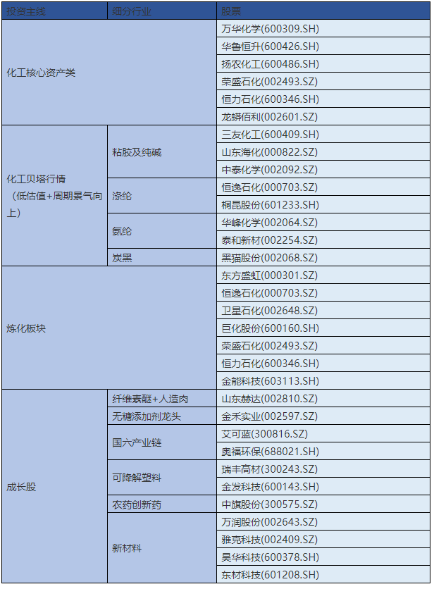 化工核心资产类已调整至估值合理水平,建议逐步配臵,中长期看这个位置只输时间不输空间。国盛证券认为龙头公司高溢价的状态未来还会长期持续,而高溢价的方向应该给到未来最确定、壁垒和竞争力最强的核心龙头,继续看好万华化学(600309.SH)等优质公司。