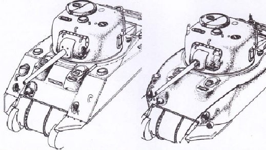 红圈1所示为粗瞄用金属标早期M4坦克炮塔旋转动力系统采用奥盖尔液压公司开发的液压装置,由于在炮塔座圈和环齿位置采用了可变冲程活塞泵和卡点设计,该系统具有极高的可控灵敏度,因此被美军军方确定为所有坦克车炮塔的标准驱动装置。此后西屋电气公司出品的电控炮塔旋转动力系统被选定为替换产品,该装置的电动机驱动可以达到3600转/分,超过双液压装置的2000转。投入量产后的M4坦克结合战场的表现不断在进行着改进,非常显著的一个就是其前部瞄准系统的变化,早期的M34炮座所采用的75主炮瞄准具是沿用M3坦克的潜望镜式瞄准具,但是这种瞄准具安放到可旋转炮塔之后却出现了与火炮的协调性误差,所以美国装甲兵委员会要求设计部门尽快采用前向瞄准具,首先在火炮后侧及炮手正前方加装了M55前向瞄准镜,稍后被M70F型所取代,而炮手原先采用的潜望瞄准镜仍然作为备用装置而没有拆除。为了保护新式的前向瞄准具,火炮炮盾进行了延展设计,向左向后全部覆盖了左侧的7.62毫米同轴机枪和右侧的瞄准装置,由于大炮盾重量的增加已经无法平衡载荷,所以军械局在75炮的炮尾加装了配重,新式炮座于1942年10月被命名为M34A1型炮座,该型炮座的有效升降角度为负10度至正25度。军方要求所有工厂在M4系列量产型尽快实现M34A1炮座的安装,而已经下发装备部队的M4、M4Al和M4A2坦克部分采用了老式M34炮座,一些尚未出厂但却已经完成M34炮座整车安装的M4系列量产型,被要求采用折中的单边防盾方案,即加装前向瞄准镜,同时在火炮炮盾右侧焊接一块钢板以保护瞄准镜。左侧的机枪仍然保留原先小防盾。1 / 2车体M4坦克的车体采用的是前向与垂直面呈56度倾斜焊接车体,而M4A1则是前向与垂直面呈37至55度的铸造车体,所以大家如果看见流线型铸造车体的谢尔曼坦克那一定就是M4A1型号。车体依照M3坦克的设计安装了通风装置,分别位于炮塔中央、车体前侧部和发动机舱上部,机舱进气口位置加装了一块3英寸厚的铸造钢板。由于侧门取消,在机电员头顶位置同样安装了舱门,并全部加装了潜望装置。机电员前部的车体前机枪有效射界为左20度,右25度,上20度,下10度。后期型号双航向机枪被取消,同时车长舱口前部的观测镜筒也被一部更加隐蔽的潜望观测装置所取代。1 / 2M4与M4A1对比,一目了然