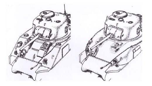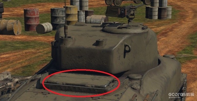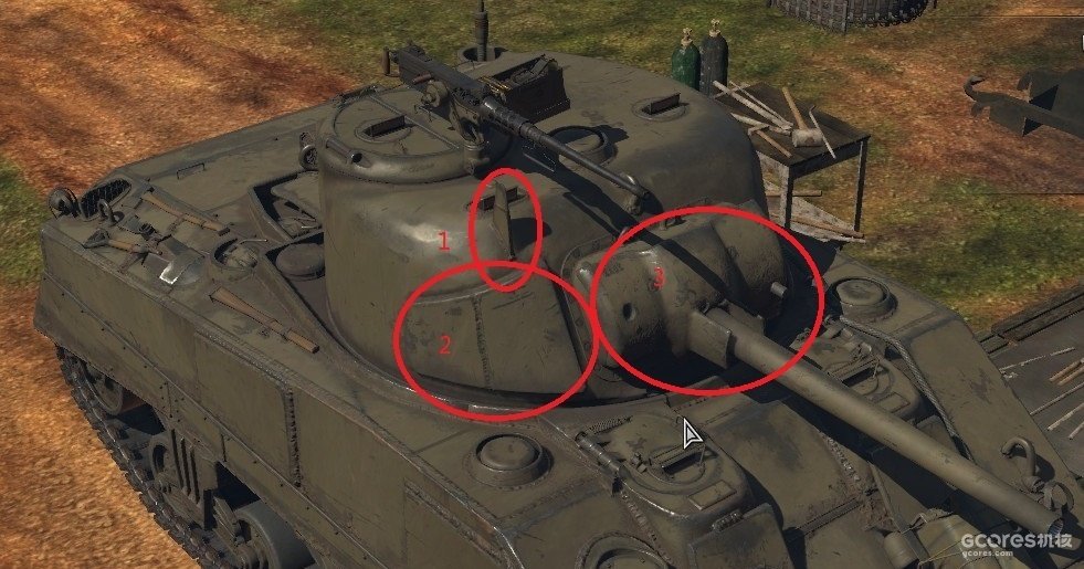 红圈2所示的就是在炮塔右侧添加的附加装甲,红圈3为加宽的炮盾从1943年中期至1944年美国人开始采用所谓湿式弹药保护法保存弹药之前,这种打补丁方案在美军中十分流行。此外,弹道测试表明谢尔曼坦克正面装甲防护参差不齐,理论上采用焊接车体的M4型正面装甲与垂直面夹角56度,厚度均为51毫米,正面等效厚度可以达到80-85毫米,但M4坦克的车身是采用分体焊接而成的,驾驶员和机电员正前位置由于考虑到拓宽空间和安装前部观察口,车体向前凸出了一部分。而正是这个部分即使去掉了前向观测口,其正面装甲也与垂直面夹角较小,厚度接近51毫米,非常容易被穿甲弹击穿。为了弥补这一缺陷,M4型坦克正副驾驶舱突出部前全部焊接了与垂直夹角55度的38毫米厚小块附加钢板。相比之下,M4A1坦克的前部铸造车体,虽然厚度也为51毫米,但却呈现出光滑的33至55度的渐进夹角,从而使其正面装甲防护水平十分均匀,还容易增加跳弹几率,所以没有安装附加装甲的必要。