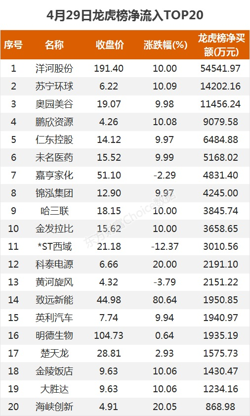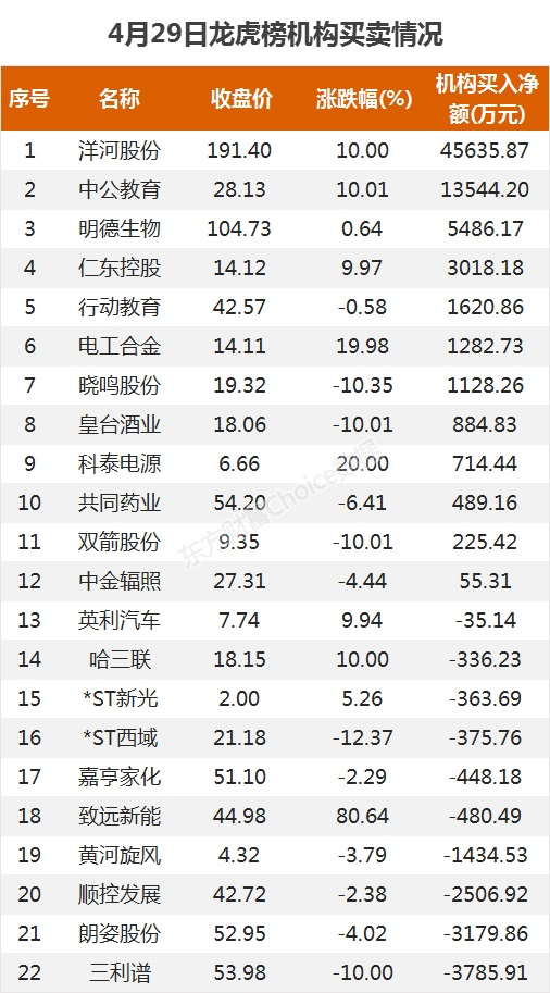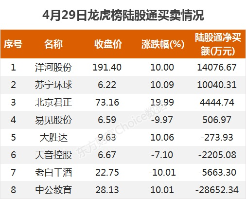 摘要【龙虎榜:5.5亿抢筹洋河股份 外资净买4股 机构净买12股】4月29日,指数午后震荡上行,截至收盘,沪指涨0.52%,报收3474点;深成指涨0.46%,报收14464点;创业板指涨0.03%,报收3051点。盘面上,证券、超级品牌、有色等板块涨幅居前;注册制次新、景点、辅助生殖等板块跌幅居前。