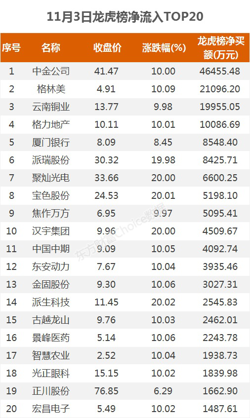 龙虎榜净流入TOP2011月3日,上榜龙虎榜个股中,资金净流入最多的是中金公司,为4.65亿元。数据显示,上市第二天,中金公司涨停收盘,全天换手率34.17%。具体看,兴业陕西分公司买入3.91亿元,华鑫深圳分公司买入9632.98万元。