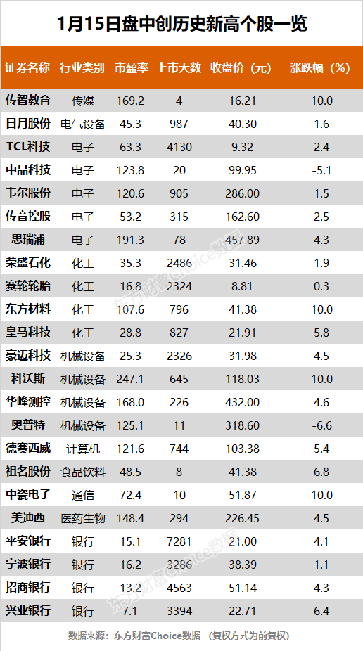 摘要【指数午后探底回升 招商银行、韦尔股份等23股创历史新高】1月15日,沪指收报3566.38点,涨0.01%。东方财富Choice数据显示,今日有23只个股盘中股价创历史新高。其中,个股包括招商银行、韦尔股份等。