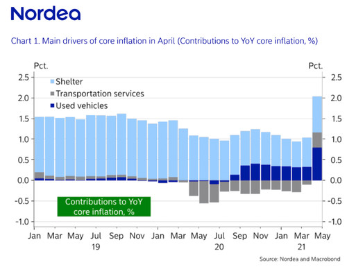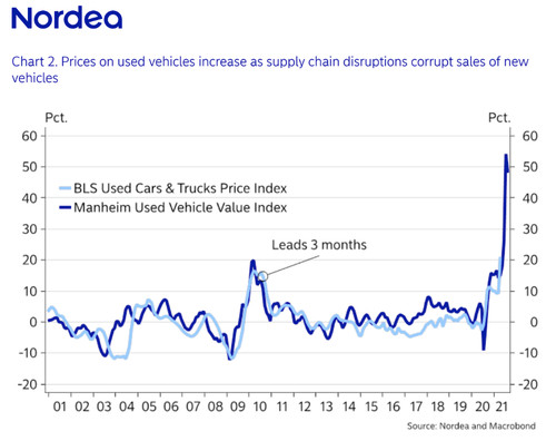 "Prices on used vehicles increased by an astonishing 21 % YoY in April (contributing 0.8% to the yearly change in core inflation). According to Manheim Consulting, prices on used cars and trucks are expected to climb further to 50 pct YoY in May or June (3 months lag). If we assume a 50% yearly increase in used cars in May (Manheim may exaggerate the yearly price increase a bit), then core inflation will potentially surpass 4%. Supply chain disruptions, shortage of semiconductors and Covid-19 restrictions have all played a part in disturbing the price action in the car market, but bottlenecks are not always the root cause of inflation - they can also be seen as a symptom," said Nordea.