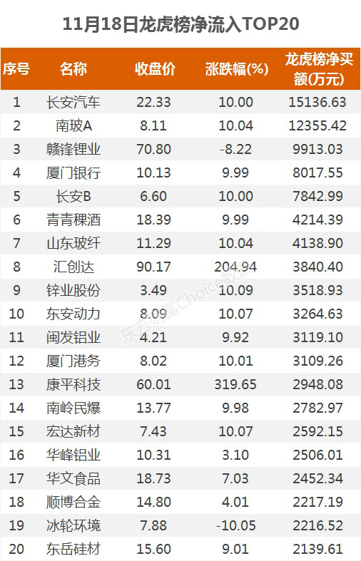摘要【龙虎榜:1.5亿资金抢筹长安汽车 机构净买这5股】11月18日,指数继续分化,呈沪强深弱格局,截至收盘,沪指涨0.22%,报收3347点;深成指跌0.54%,报收13658点;创业板指跌1.41%,报收2620点。盘面上,有机硅、福建自贸区、草甘膦等板块涨幅居前,中韩自贸区、白酒、医疗器械等板块跌幅居前。