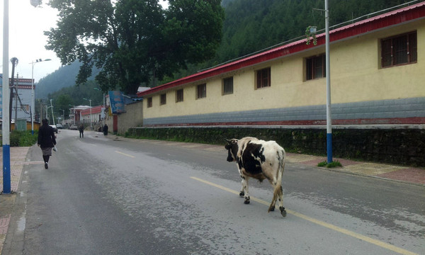 6月7日,今天的行程:亚东县--岗巴县--定结县。昨晚住的酒店不提供早餐,大家各自结伴出门觅食 。大街上一只悠闲的小牛在散步,旁边没有主人,谁家的呢。。。。。。