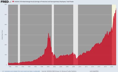 Alas, American workers had neither. When Greenspan was nominated to head the Fed in July 1987, the average wage was $9.12 per hour and the NASDAQ 100 index stood at 196. That is, it took about 22 hours of work to buy the index.