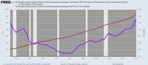 As it happened, under Greenspan’s phony “disinflation” policies and then Bernanke’s formal inflation-targeting regime thereafter, the domestic price level was inflated by another 70% or 2.14% per annum between 1995 and 2020. What that meant was fully two-thirds of the gain in average hourly wages during that period was eaten-up by domestic inflation when the order of the day should have been wringing out some of the staggering 240% increase in the domestic price level that had occurred between 1972 and 1995.