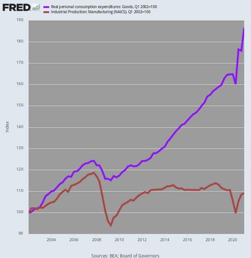 As a result, real consumption spending (PCE) for goods rose by 87% or 3.0% per annum between Q1 2002 and Q1 2021. Yet during the same 19 year period, the industrial production index for manufacturing rose by only 9% or barely 0.41% per year.