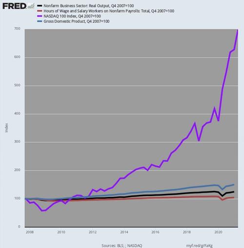 At the close of June 2021, the average hourly wage– as we learned this AM—was $25.68 per hour, while the NASDAQ 100 had taken flight to another financial planet, posting at 14,554. That is, it now took 566 hours of work to buy the index or 26X more than when Greenspan inaugurated wealth effects monetary policy.