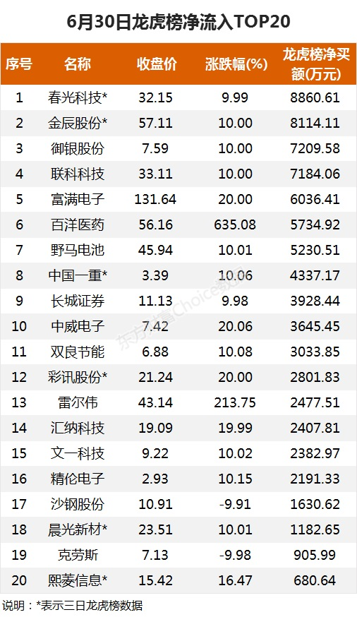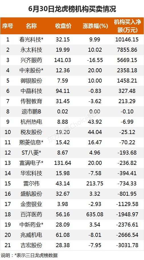 【龙虎榜:8900万抢筹春光科技 外资净买1股 机构净买7股】6月30日,A股上半年收官,三大指数皆收红,截至收盘,沪指涨0.5%,报收3591.2点;深成指涨1.08%,报收15161.7点;创业板指涨2.08%,报收3477.18点。盘面上,安防设备、电子元件、材料行业等领涨;木业家具、农牧饲渔、工艺商品等领跌。