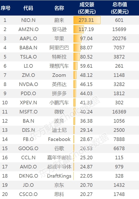 而成交金额方面更夸张,蔚来汽车单日盘中成交273亿美元,创中概股单日成交额历史记录,也力压同期亚马逊117亿美元和苹果97亿美元的成交额。