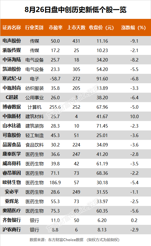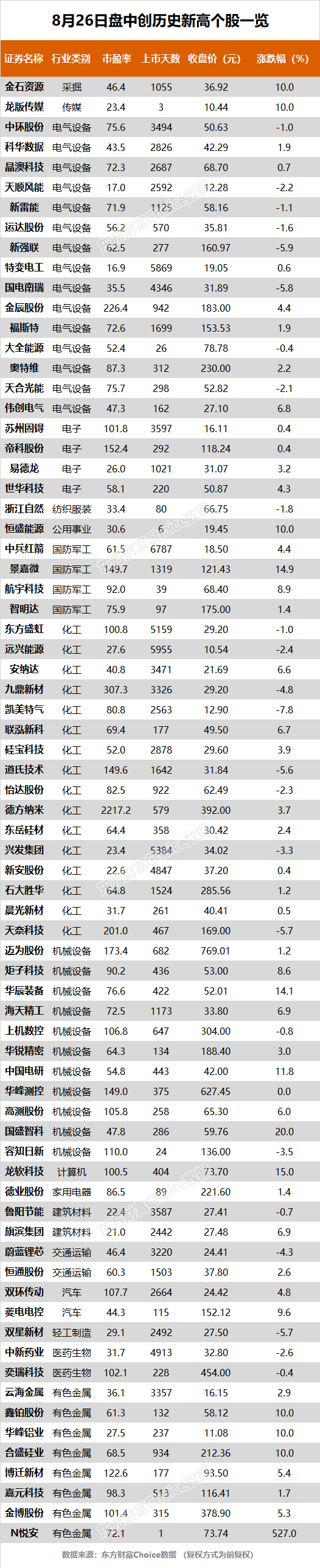 8月26日,沪指收报3501.66点,跌1.09%;深证成指收报14415.46点,跌1.92%;创业板指收报3264.45点,跌2.51%。东方财富Choice数据显示,今日有73只个股盘中股价创历史新高,包括合盛硅业、华辰装备等。