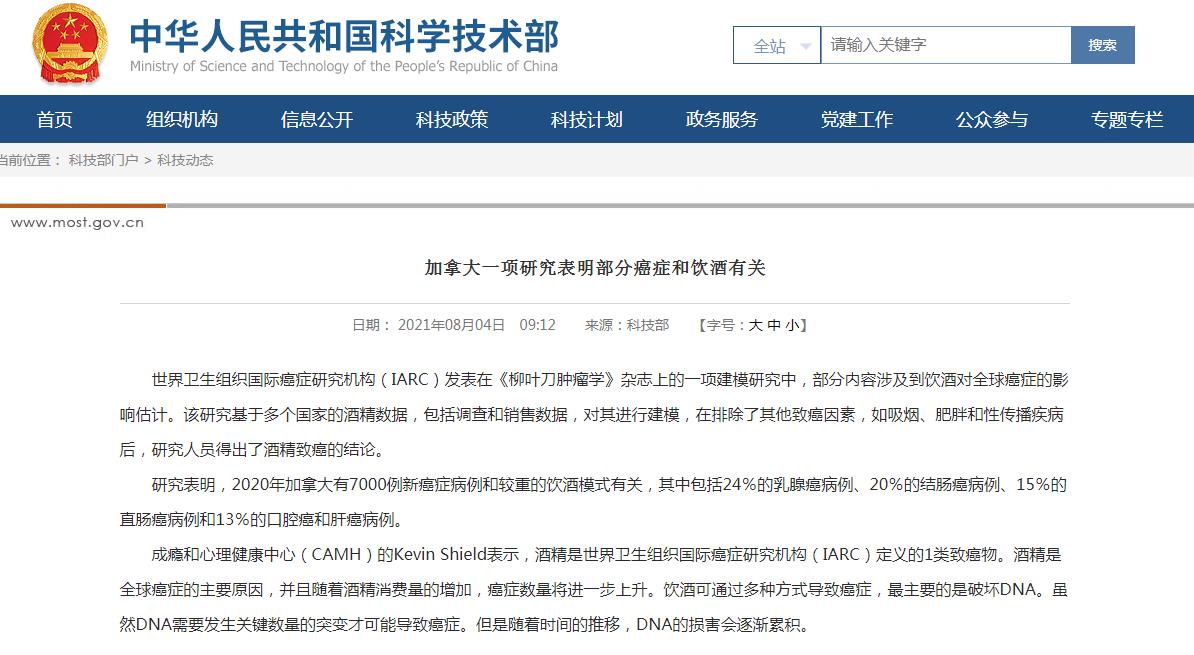 科技部网站刊文:加拿大一项研究表明部分癌症和饮酒有关