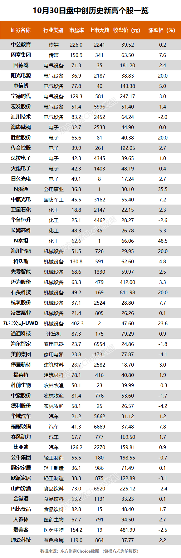 【指数午后单边下行 阳光电源、海川智能等49股创历史新高】10月29日,沪指收报3224.53点,跌1.47%。东方财富Choice数据显示,今日有49只个股盘中股价创历史新高。其中,个股包括阳光电源、海川智能等。