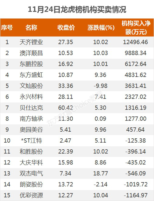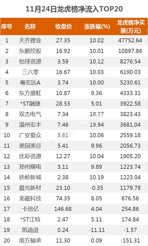 摘要【龙虎榜:4.78亿资金抢筹天齐锂业 机构净买这9股】11月24日,指数全天震荡整理,截至收盘,沪指跌0.34%,报收3402点;深成指跌0.38%,报收13902点;创业板指跌0.43%,报收2674点。盘面上,油气设服、稀土永磁、钢铁等板块涨幅居前,染料、医美、啤酒等板块跌幅居前。
