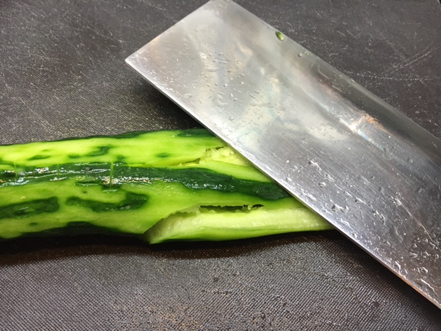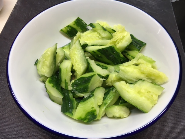4. 拍完的青瓜切成小段後, 把青瓜段放入食物袋內,