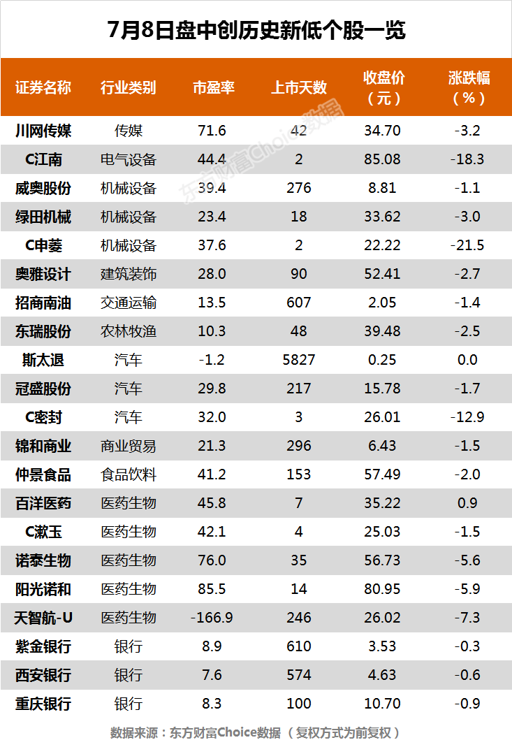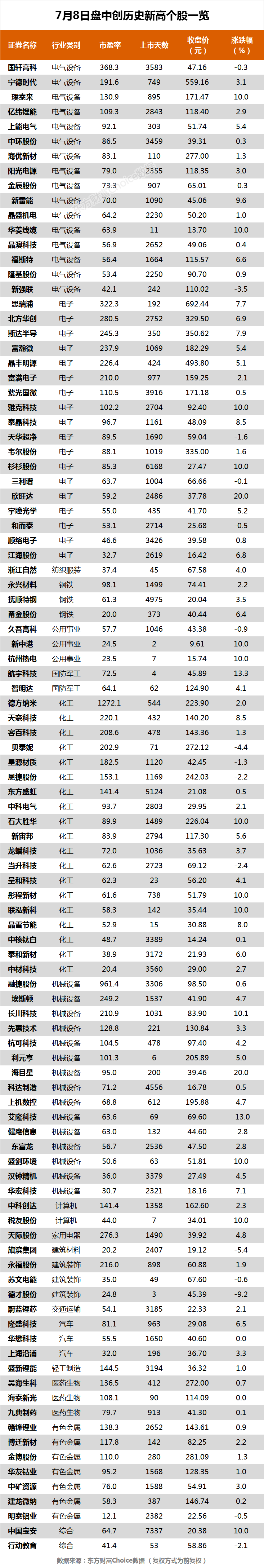 7月8日,沪指收报3525.50点,跌0.79%;深证成指收报14882.90点,跌0.38%;创业板指收报3432.96点,涨0.69%。东方财富Choice数据显示,今日有101只个股盘中股价创历史新高,包括亿纬锂能、宁德时代等。
